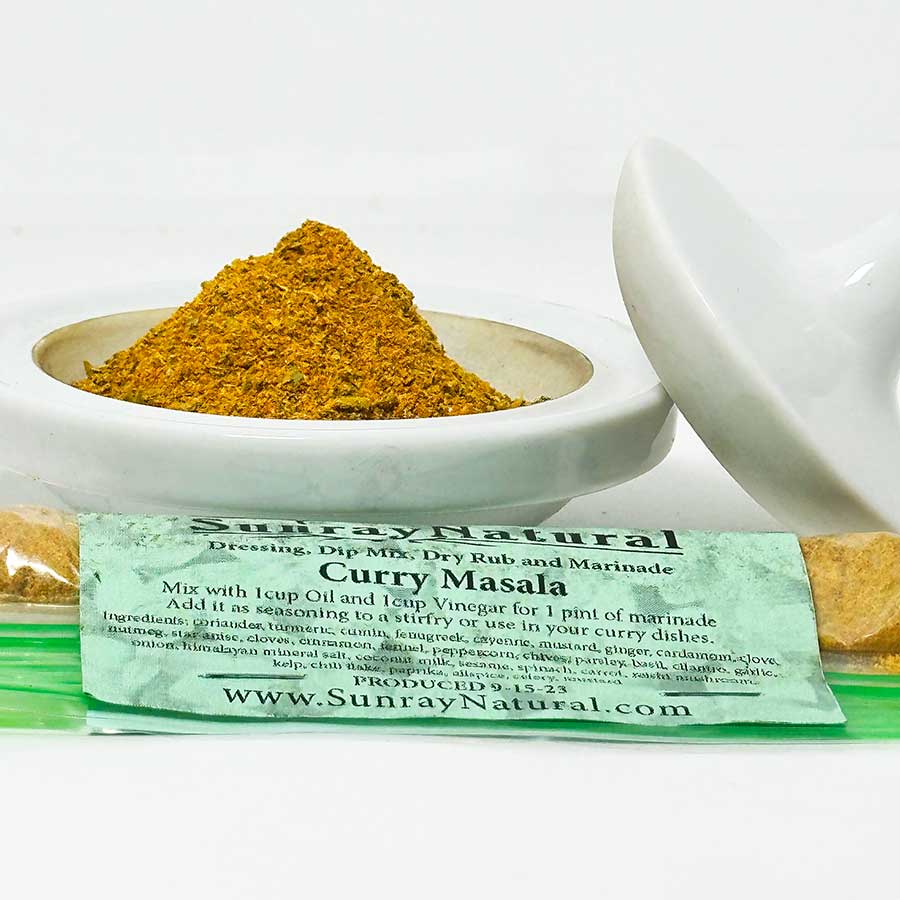 Ingredients: coriander, turmeric, cumin, fenugreek, cayenne, mustard, ginger, cardamom, clove, nutmeg, star anise, cloves, cinnamon, fennel, peppercorn, chives, parsley, basil, cilantro, garlic, onion, himalayan mineral salt, coconut milk, sesame, spinach, carrot, reishi mushroom